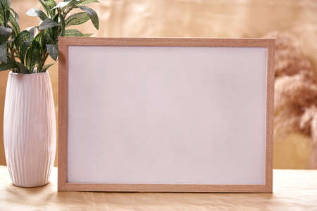 Minimalistic mock - up frame background with olive tree branch in the vase. Beige interior. High quality photo