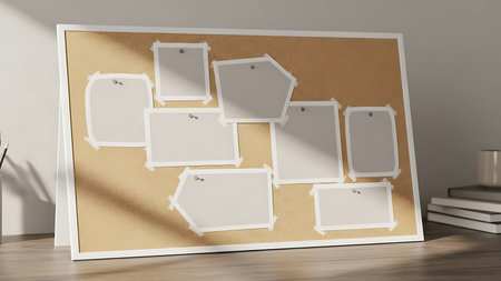 A corkboard with blank frames on a desk for organizing notes and ideas