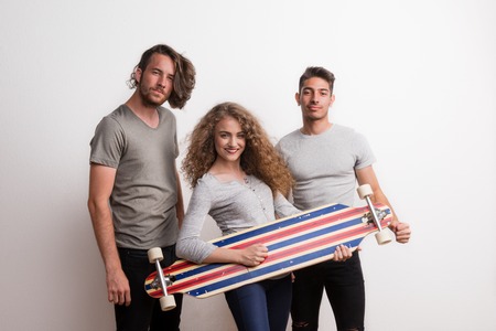 Portrait of joyful young friends standing in a studio, holding longboard.