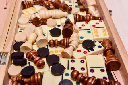 Chess pieces, dice, playing cards, wooden checkers and dominoes for board games on a table close up.
