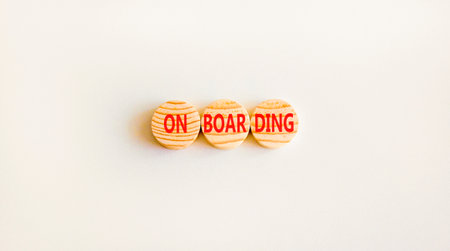 Onboarding success symbol. Concept word Onboarding on wooden circles. Beautiful white background. Business onboarding success concept. Copy space.
