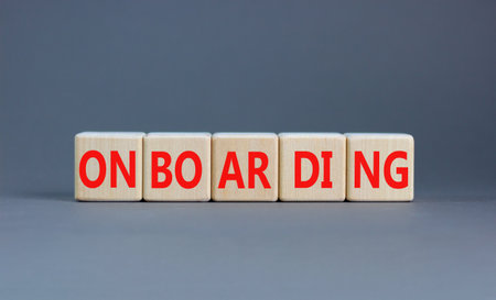Onboarding symbol. The word 'Onboarding' on wooden cubes. Business and onboarding concept. Beautiful wooden table, white background. Copy space.
