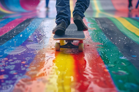 Skateboarder riding on a vibrant wet surface with rainbow colors and splashing water droplets. Extreme sport lifestyle concept