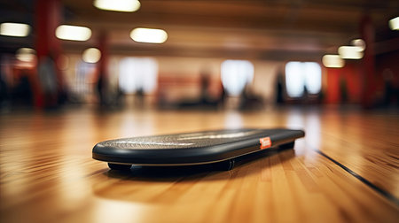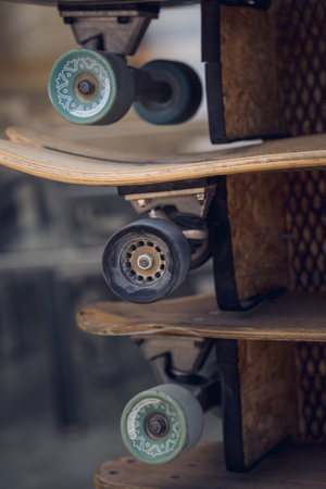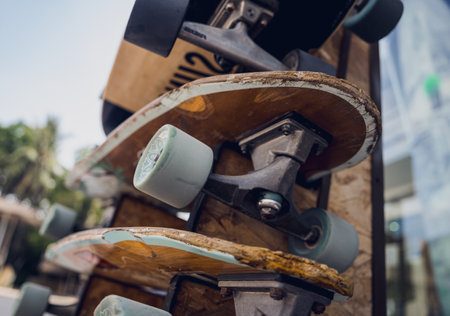 A skateboard with a vibrant yellow deck and red wheels leans against a textured blue wall, capturing an energetic and youthful vibe perfect for urban themes.