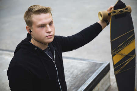 Portrait guy with a skateboard. Modern skater concept