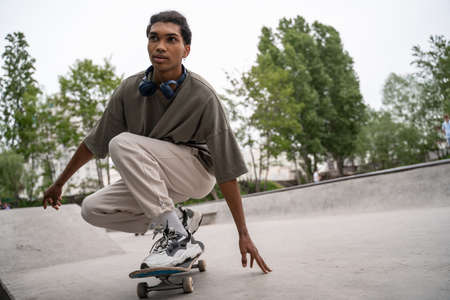 young african american man riding skateboard in squat pose