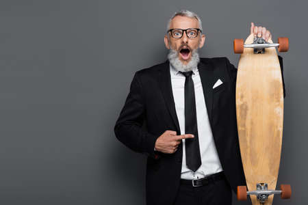 shocked middle aged businessman in suit and glasses pointing at longboard on gray