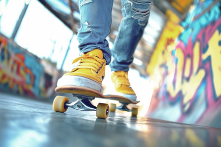 A young man skillfully rides his skateboard in vivid sneakers, showcasing the dynamic spirit of street style against colorful graffiti.