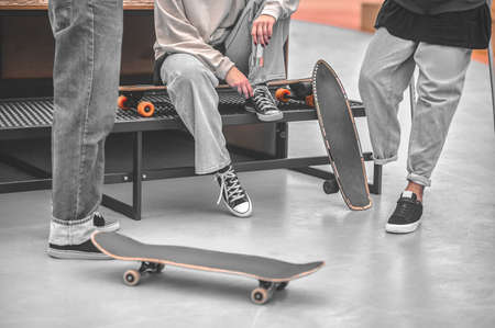 Legs of three skateboarders communicating having rest