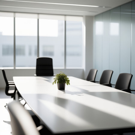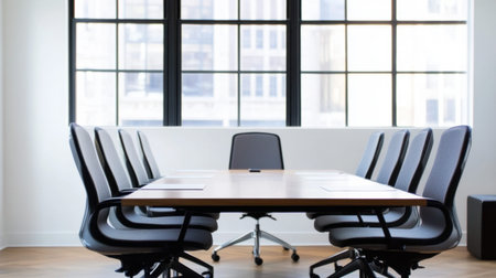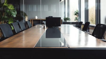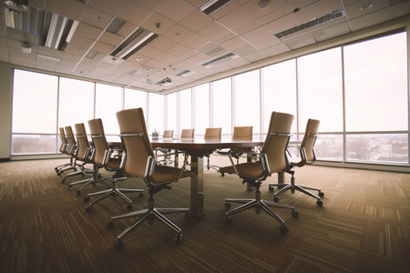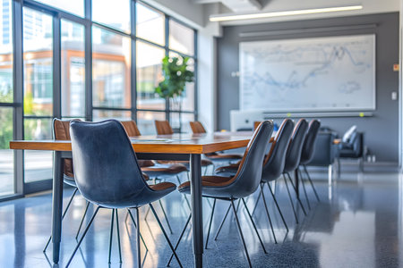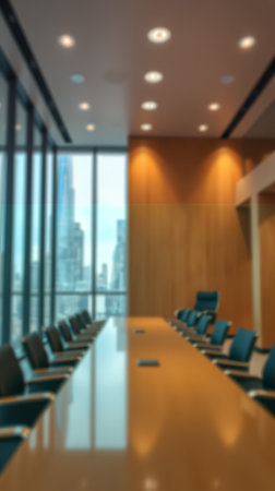 Room Perspective blurred office background, emphasizing a conference room setting with a stylish meeting table and chairs. Generative AI