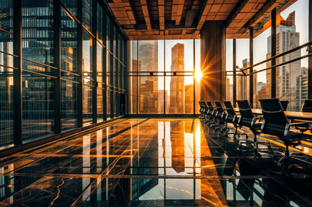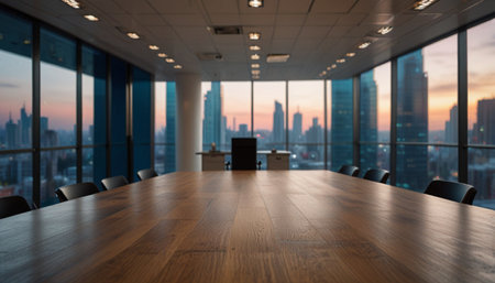 Modern board room with city view at sunset