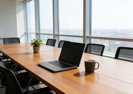 Laptop and coffee cup on wooden table in modern meeting room.