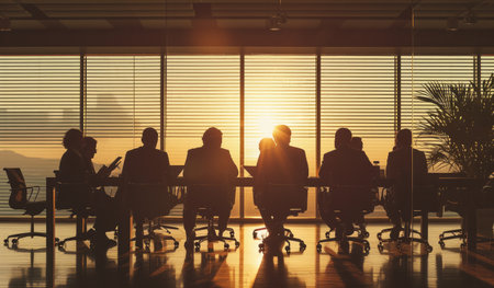 Silhouette of business people in meeting room with sunset light.