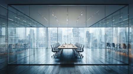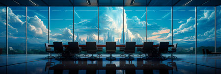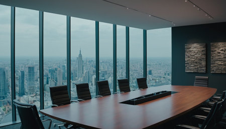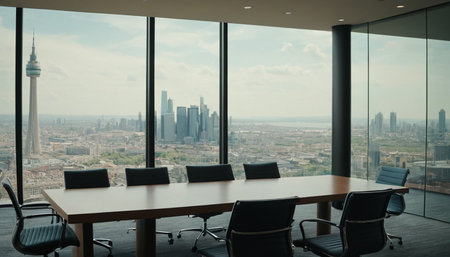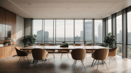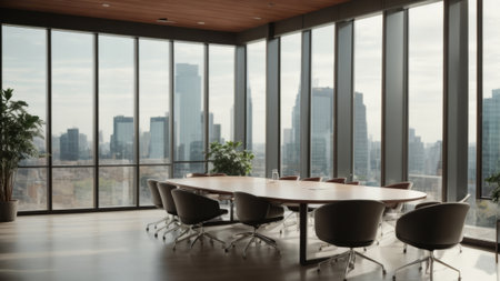 Meeting room in modern office with panoramic city view.