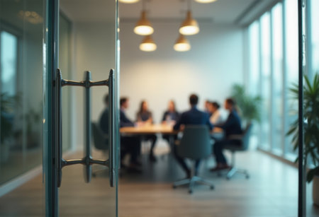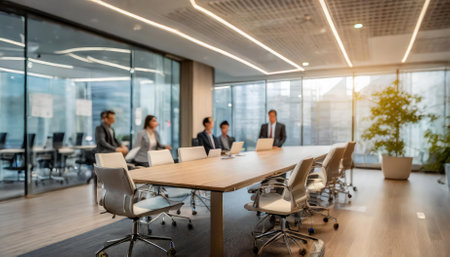An abstract view of business professionals meeting in a sleek, modern conference room. The focus highlights teamwork and brainstorming amidst a contemporary environment, illuminated by natural