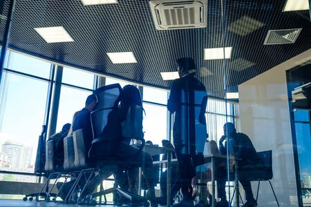 Businessman in meeting room with big windows. Silhouettes of businessmen working together and discussing issues. Sunlight office. Big city. Concept of teamwork and decision making. Dutch view, Conference room office