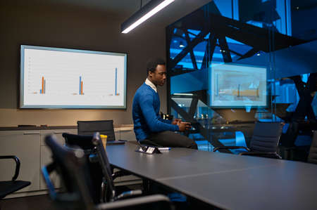 male business coach in a suit conducts a seminar. Business speaker shows a presentation. Advanced training for the company.