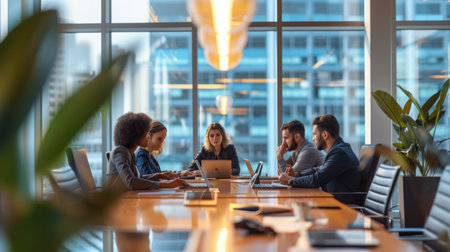 A group of professionals seated around a table in a modern office setting, engaged in a meeting. The office features large windows, allowing natural light to fill the space, and is decorated with potted plants. The participants are focused on their laptops and documents, indicating a serious discussion or presentation.