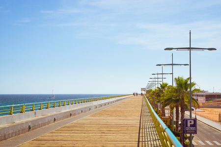 TORREVIEJA, SPAIN - SEPTEMBER 13, 2014: Pedestrian bridge-pier - way through Puerto deportivo Marina Salinas to Faro Torrevieja. Reinforced concrete pier for pedestrians-tourists, leading to sea, encircles Bay Marina. Valencia, Spain