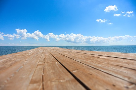 Wooden pier, sea and a blue sky. Beautiful background. Minimalism