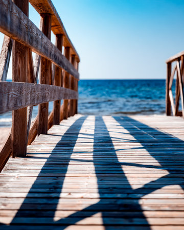 A tranquil wooden walkway extends over shimmering waters, casting intricate shadow designs on the aged planks beneath a bright, cloudless sky.