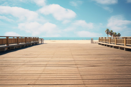AI Generated. A beautiful beach scene with a wooden boardwalk leading to the water
