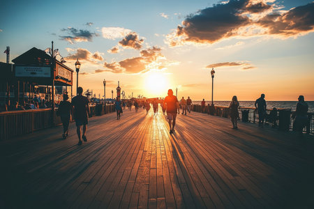 People walk leisurely along the wooden boardwalk during sunset, casting long shadows. The vibrant sky contrasts with the calm ocean, creating a peaceful atmosphere.