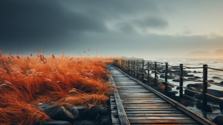 AI Generated. Exploring a Scenic Wooden Walkway to the Ocean Coastal Paradise Nature Tranquil Landscape Serene Views