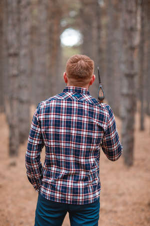 A man in a checkered shirt holds an ax on his shoulder standing with his back in the autumn forest