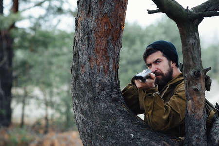 Autumn hunting season. Hunter with shotgun gun on hunt. Autunm hunting. Poacher with Rifle Spotting Some Deers. Close up Portrait of hamdsome Hunter.