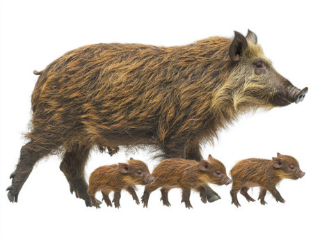 mother wild boar leads her curious piglets on a gentle walk, showcasing the beauty of wildlife family dynamics in a minimalistic setting.