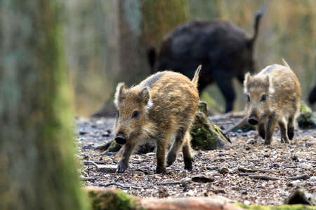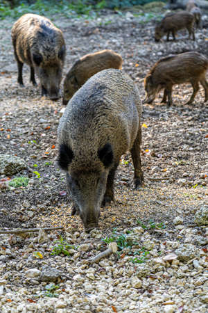 Sus scrofa - The wild boar, which is in the deep forest, is of different ages and seeks food in the dark forest.