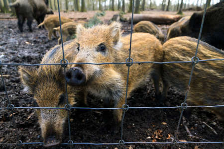 Young wild boar in animal enclosure. Animal theme. Wildlife park in Warstein, Germany