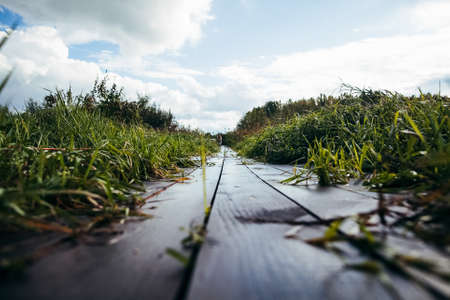 a wooden path runs through the grass, a wet wooden path, a path in the garden made of planks