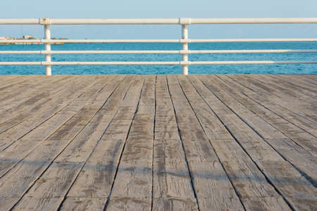 Close-up of plank boardwalk on sea pier in Limassol, Cyprus