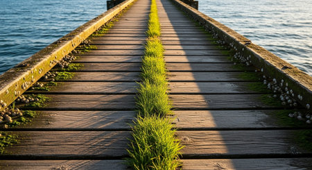 Background of a deserted rustic wooden jetty made from planks of timber extending out over rippling water