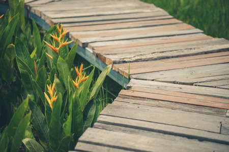 wooden walkway & green leaves in garden park