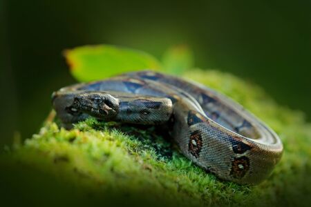 Boa constrictor snake in the wild nature, Costa Rica. Wildlife scene from Central America. Travel in tropic forest. Dangerous viper from jungle. Snake in the green moss tree trunk.