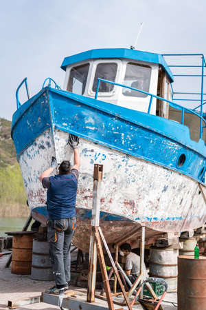 Virpazar, Montenegro - April 2018 : Men repairing and repainting old large fishing boat in a port in Virpazar town