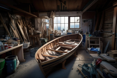 a wooden boat being built in a workshop, with tools and materials nearby, created with generative ai