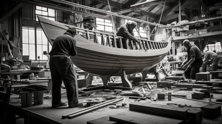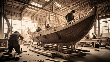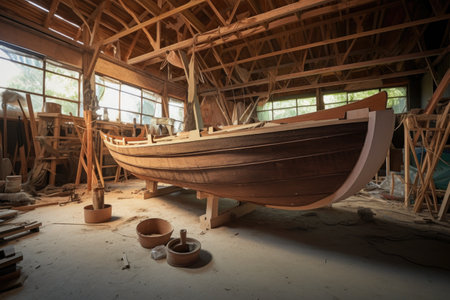 wooden boat under construction in a boatbuilders workshop, created with generative ai