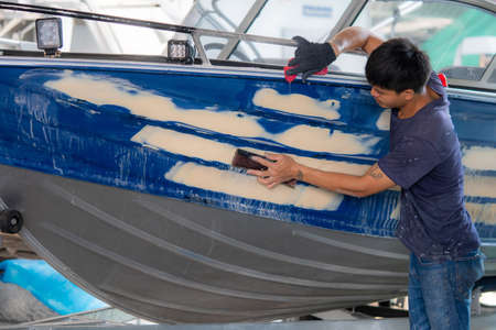 Repairing boat body by puttying close up work after the accident by working sanding primer before painting