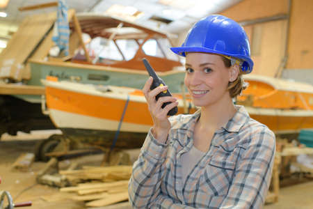 A woman wearing a blue helmet and a black vest stands in front of a large ship. She is a worker at a shipyard