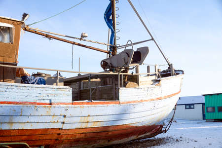 Old green fishing boat standing on land in a small village, sandy shore of the Baltic sea. Jurmalciems, Latvia. Vessel, transportation, logistics, industry, fishing, farm, food production. Rural scene
