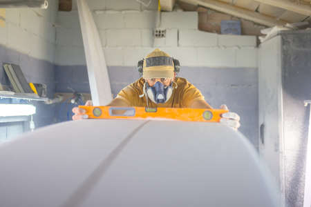 Shaper measuring the proportions of a surfboard in a workshop with a mask