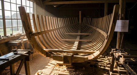 The curved wooden frame and ribs of a large boat are under construction inside a rustic shipbuilding workshop. Beams of sunlight stream through a large window, illuminating sawdust in the air and highlighting the craftsmanship. This image represents shipbuilding, woodwork, construction, and traditional craft.