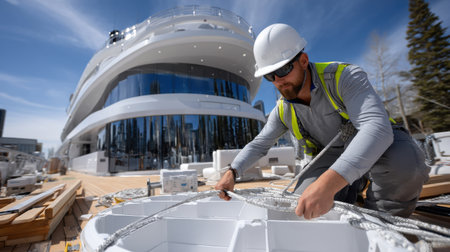 A construction supervisor wearing a hard hat, inspecting a nearly completed yacht, with his back facing the camera in an industrial shipyard setting