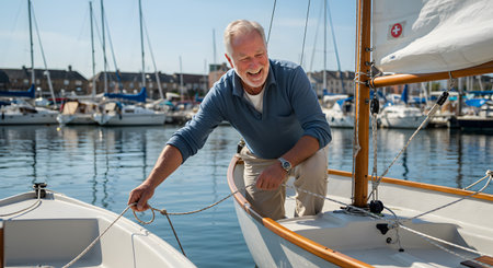 Happy senior man prepares his sailboat in a sunny marina, smiling brightly as he handles the ropes with care.