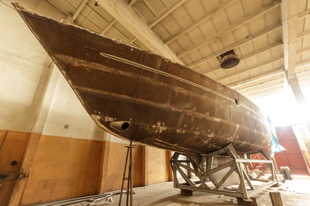 The hull of an old boat is the frame of a wooden boat, a wooden structure consisting of the keel and frames of a half-built boat. natural light