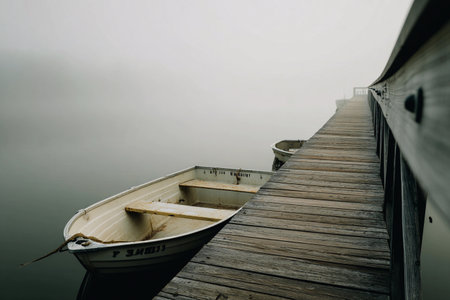 Soft morning light casts a tranquil scene at a wooden pier, where boats float silently in fog.